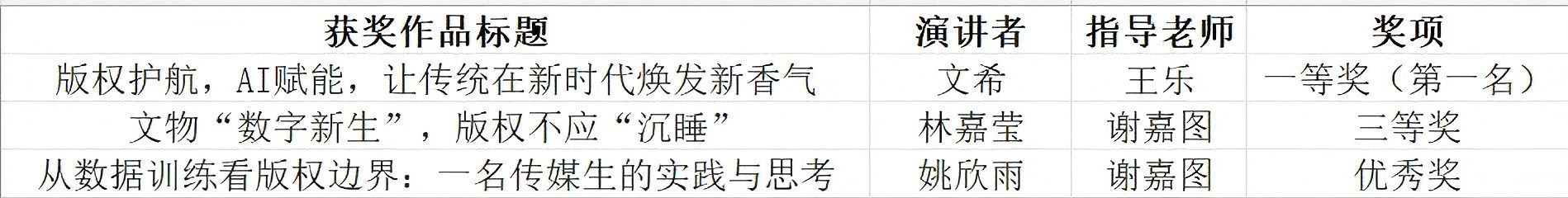 比赛中,文希同学以广东非遗美食为切入点,阐释版权对传统文化创新的保护作用;林嘉莹同学以数字文物“皇后之玺”为例,探讨文化遗产数字化中的版权保护机制;姚欣雨同学结合亲身经历,分析人工智能训练与版权边界问题。三位同学的演讲紧扣时代脉搏,主题鲜明、见解独到,展现了汕大学子的思辨风采与时代关怀。
