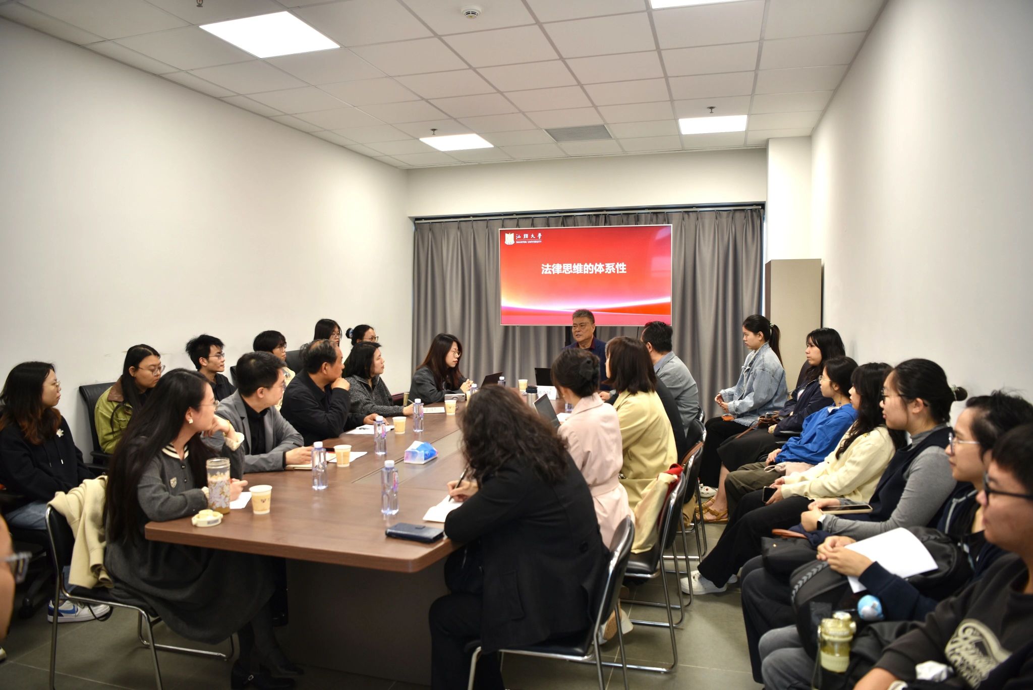 讲座伊始,陈金钊教授从三个生动案例切入,引导听众思考“有法律依据是否必然正确”“体系为何仍需区分”等根本性问题。他指出,形式法治思维强调接受制定法约束、遵循逻辑规则、注重语义解释、运用体系思维及探求立法原意,构成法治运行的基础框架。与此同时,面对复杂现实,实质法治思维通过目的性观察、利益衡量与法律续造等方式发挥补充作用,但其适用应以形式法治思维优先为前提,“若能通过形式规则解决纠纷,则不轻易启动衡量与续造”。 陈金钊教授进一步阐释,“据法思考”并非机械套用法律条文,而是“法律注我,我注法律”的双向互动过程,需在具体语境中动态理解“法”的意义。他特别强调“认真对待法律的体系性”与“法源思维”的重要性,指出唯有将逻辑与现象、一般原则与个体情境相结合,才能真正导向公平公正的司法实践。整场讲座内容层层递进、深入浅出,兼具理论高度与现实关照,令在场师生深受启发。在互动环节,陈金钊教授还与听众就体系思维在司法实践与法学教育中的具体运用进行了深入交流。