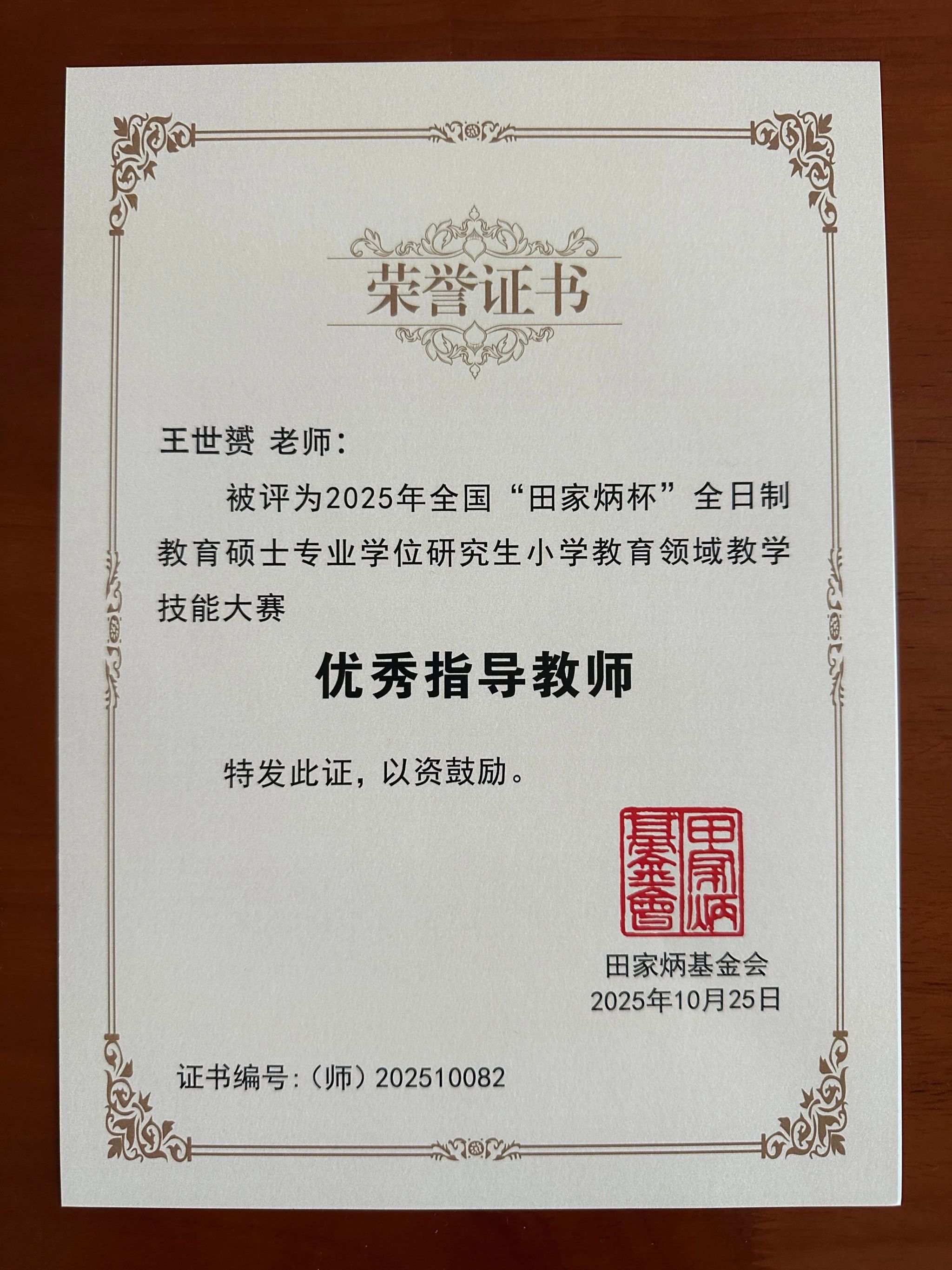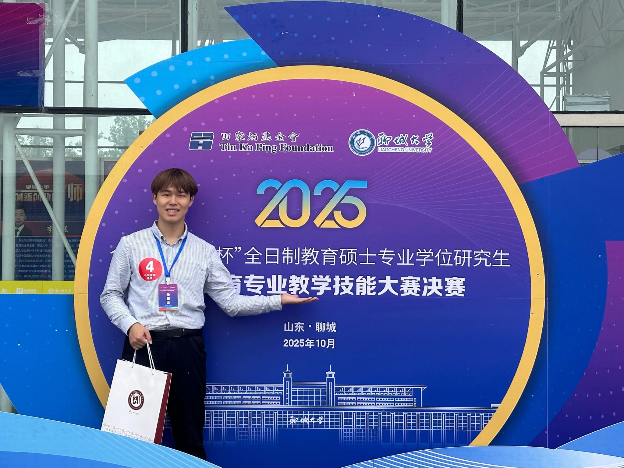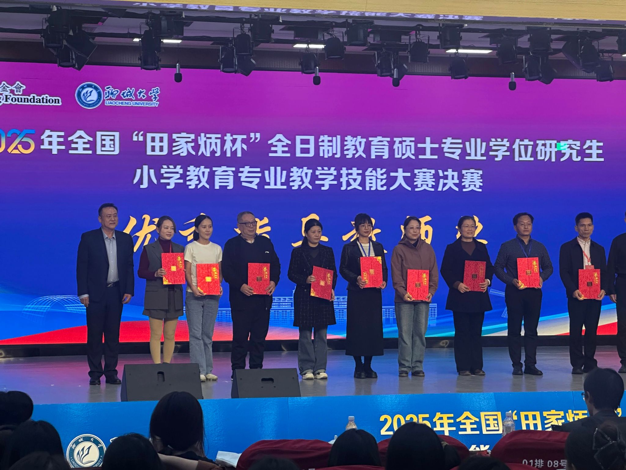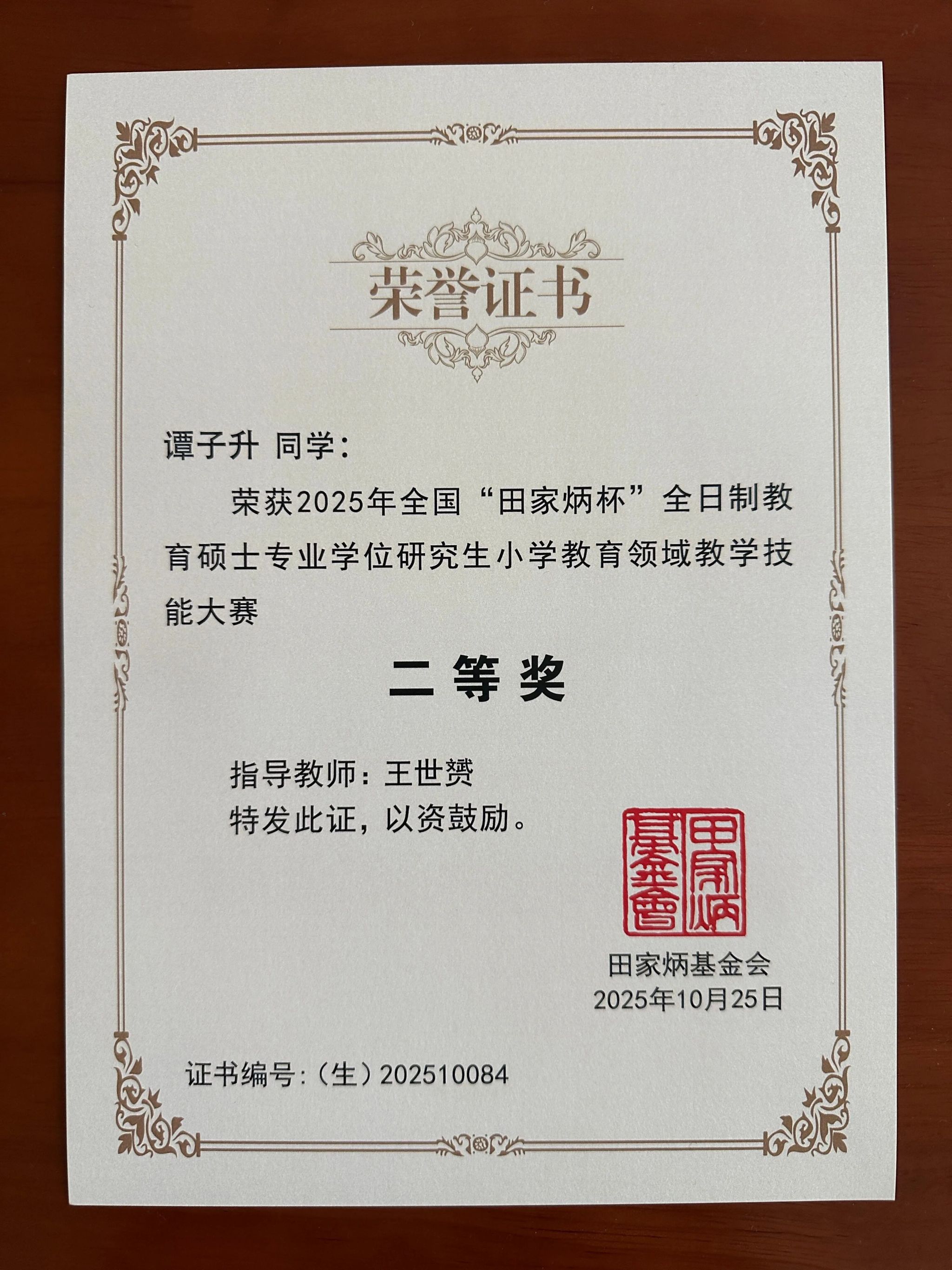 10月25日,2025年全国“田家炳杯”全日制教育硕士专业学位研究生小学教育专业教学技能大赛决赛在山东省聊城大学顺利举行。经激烈角逐,我校法学院高等教育科学研究所2024级小学教育专业研究生谭子升同学作为学校唯一参赛代表,在小学英语赛道脱颖而出,荣获全国“田家炳杯”总决赛二等奖(约占决赛选手总数的20%);王世赟老师荣膺优秀指导教师奖,成功实现我校教育硕士在全国教学技能大赛舞台上的零突破。