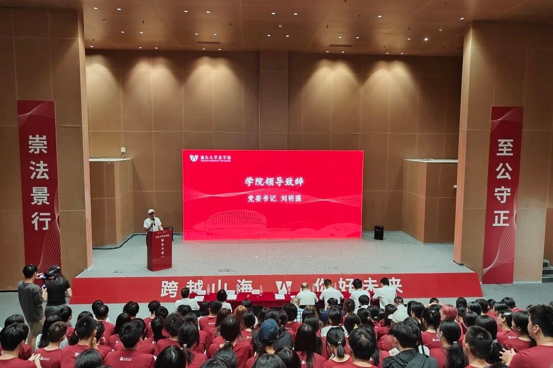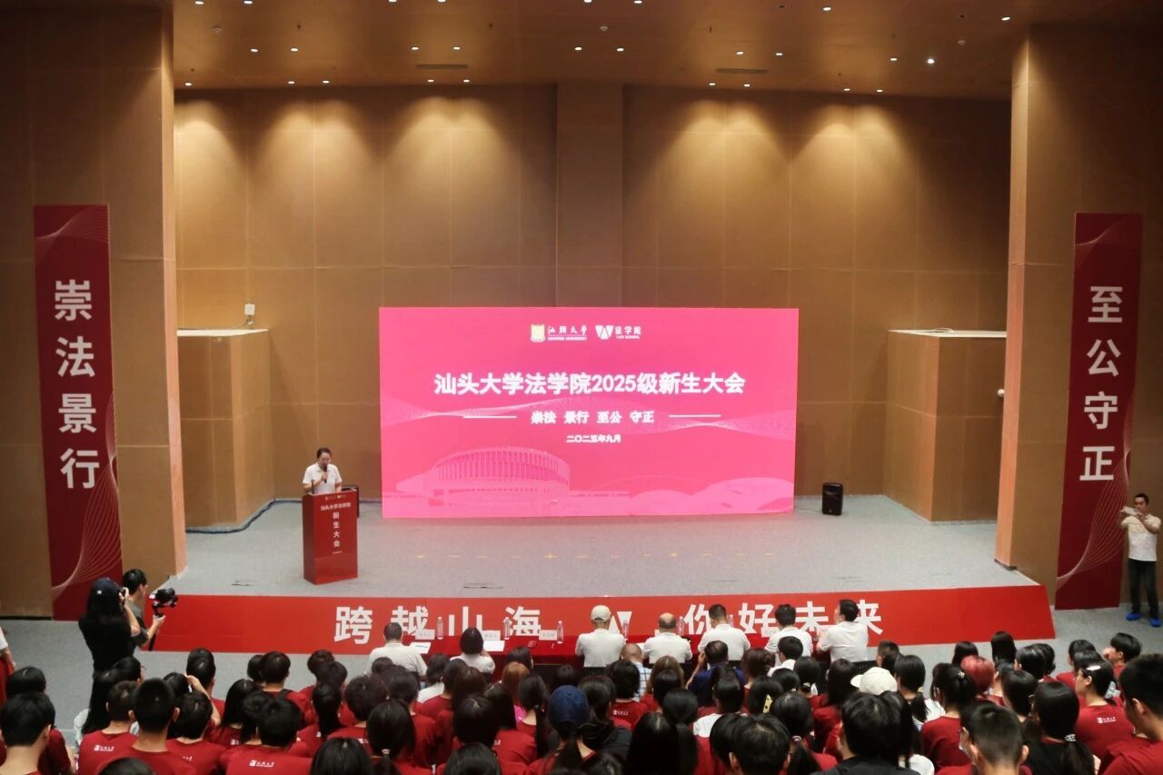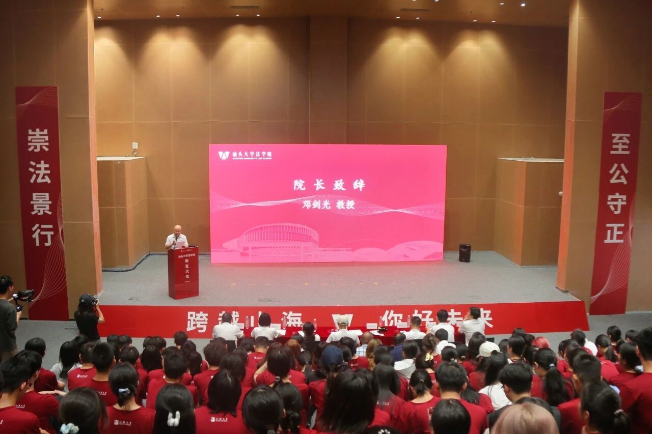 迎新盛宴,暖意融融,跨越山海,你好未来!为帮助新生快速适应大学生活节奏、了解学院概况,法学院2025级新生大会在东海岸校区举行。院党委书记刘明强、院长邓剑光、副院长邱国良、高教所负责人康全礼等院党委领导班子成员、教师代表、辅导员老师以及全体2025级本硕新生五百余人出席会议,并邀请法学院优秀校友彭童峰先生参会。会议由法学院党委副书记张丽婷主持。