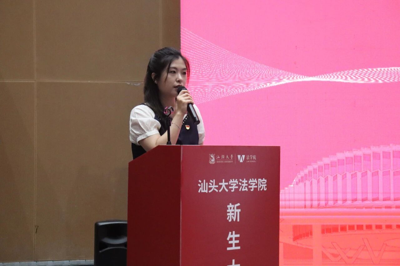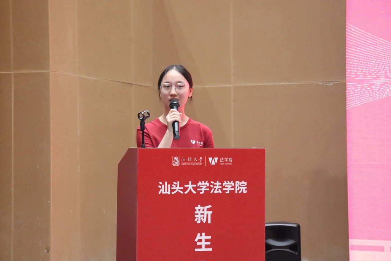 2025级法学专业(涉外法务英语特色班)本科生沈慧楠作为本科生新生代表发言。她柔声回忆报到时的一幕幕情景:学长学姐主动带路、老师耐心解疑、同学微笑搭话,这一切都让她快速消除陌生感,并提及自己对“有志、有识、有恒、有为”人才培养目标的理解,传递了新生对未来专业学习与成长的美好期许。