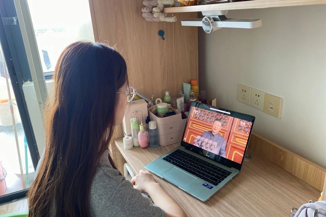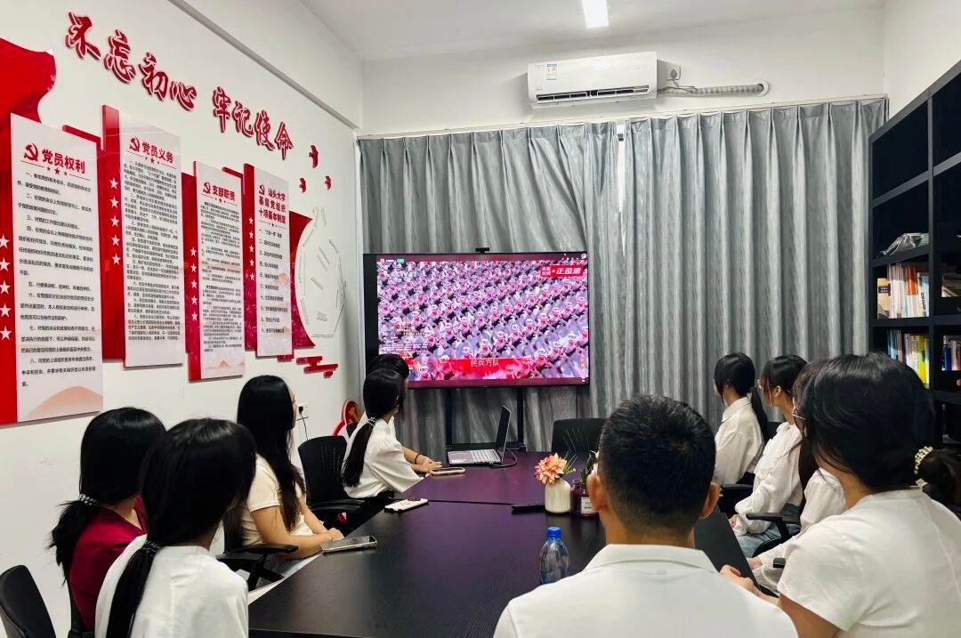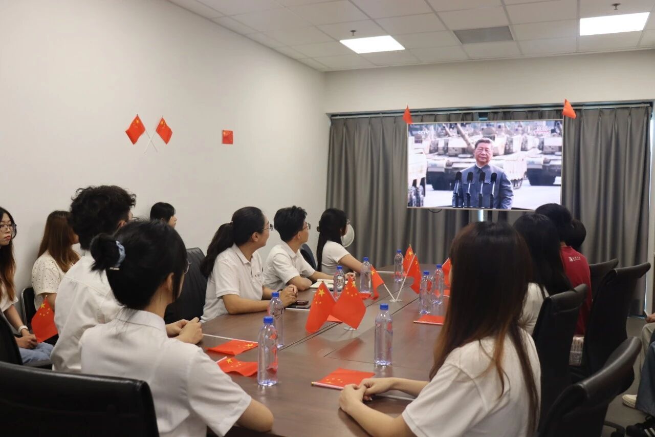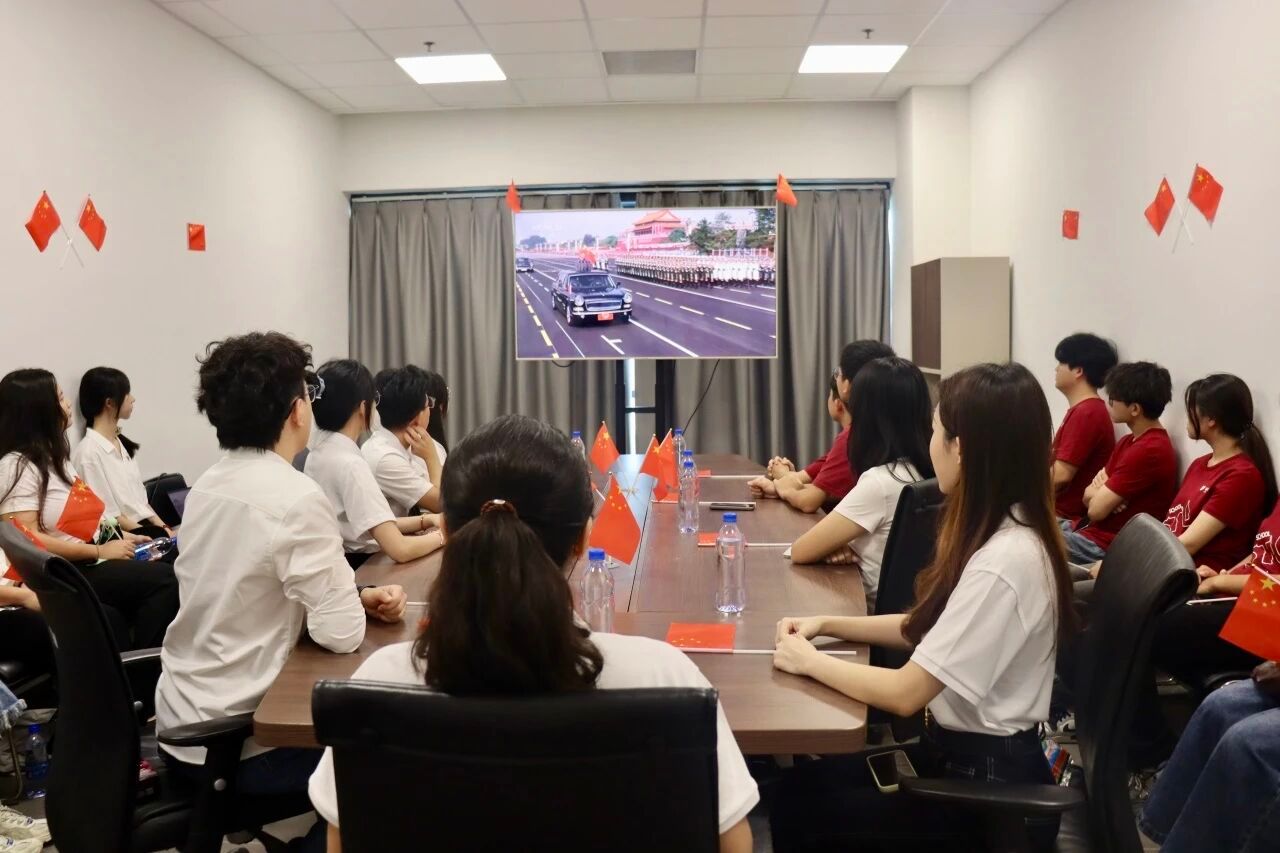 上午9时,直播正式开始。师生们起立齐唱中华人民共和国国歌,注视着五星红旗冉冉升起。师生全神贯注,认真聆听习近平总书记的重要讲话,观看阅兵队伍集中展示。