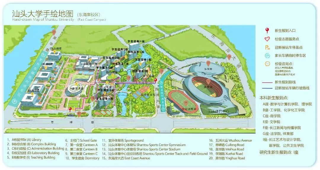 9月5日,学校分别在汕头火车站、高铁汕头南站、高铁潮汕站、潮汕机场(前往东海岸校区)设置“汕头大学新生入学报到接待站”,安排车辆接新生到学校。新生到达学校后,可按如下汕头大学手绘地图找寻具体目的地,或询问当日在场迎新的志愿者们!