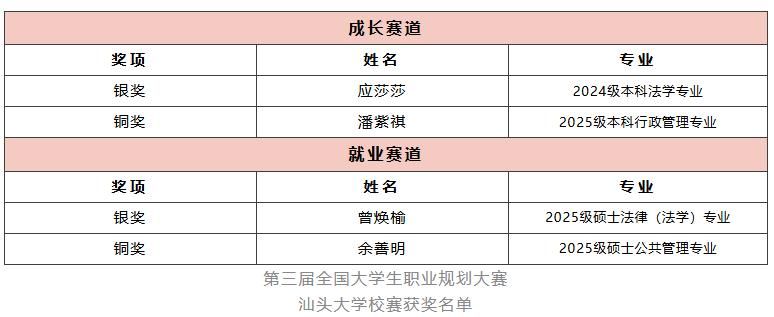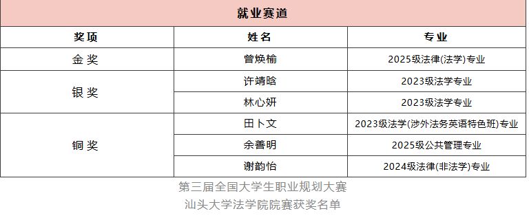 为深入贯彻党中央、国务院关于高校毕业生就业工作的决策部署,切实加强生涯教育与就业指导,11 月 30 日,第三届全国大学生职业规划大赛汕头大学校赛决赛在汕头大学桑浦山校区顺利举办。法学院荣获优秀组织奖,参赛学生以扎实的专业基础、清晰的职业规划与昂扬的青春风貌脱颖而出,共摘得4项个人奖项(2个银奖、2个铜奖),成为赛事中的突出代表。