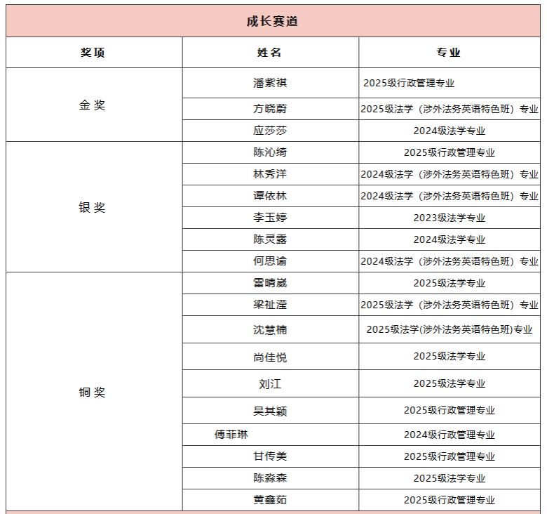 获奖同学以青春之志锚定职业方向,以专业能力赋能未来发展,他们的成绩不仅为个人成长积累了宝贵经验,更向全校展示了法学院学生 “志在四方、脚踏实地” 的奋进姿态,为广大同学树立了职业规划的优秀标杆,极大激发了全院学生探索职业道路、提升就业竞争力的热情与信心。