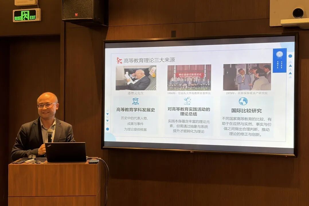 研讨会首先由厦门大学教育研究院陈斌副教授发言。他以“实践智慧:高等教育理论创新的源泉”为题,分享了自己跟随潘先生学习、参与教育实践的心得。他提出,潘先生关于高等教育理论来源的三个路径——历史、实践与国际借鉴,其中实践尤为重要。他结合自己在福建省民办高职院校调研的经历,指出理论创新必须扎根实践,研究者需要具备将工作问题转化为学术问题的能力,才可能真正实现潘先生所言的“板凳敢坐十年冷,文章不写半句空”的治学境界。