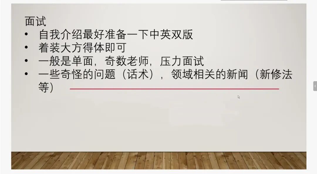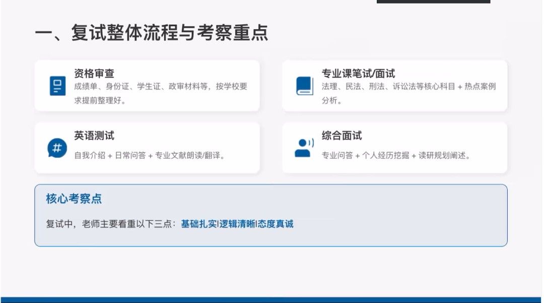 华东政法大学的侯若兰则系统梳理了考研复试的整体流程,着重强调扎实稳固的知识基础与严谨踏实的学习态度,是顺利通过复试的核心关键。她还提醒同学们要注意“面试软实力”,细致讲解了政法类院校面试的着装规范、眼神交流技巧,并分享了自己整理的“专业英语应急话术”,叮嘱同学们在英语面试中要“敢表达、讲细节”,避开模板化误区。