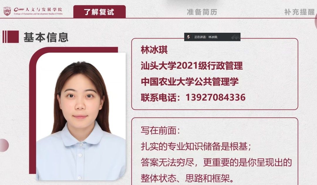 中国农业大学林冰琪则全方位、细致地讲解了复试各环节的注意事项与实用小技巧,强调得体的外在形象对展现专业素养的重要性。围绕“科研潜力展示”展开分享,她提到中国农大的复试十分看重考生的实践落地能力,建议同学们提前梳理参与过的社会调研、课题项目,用具体数据和成果突出自身优势。