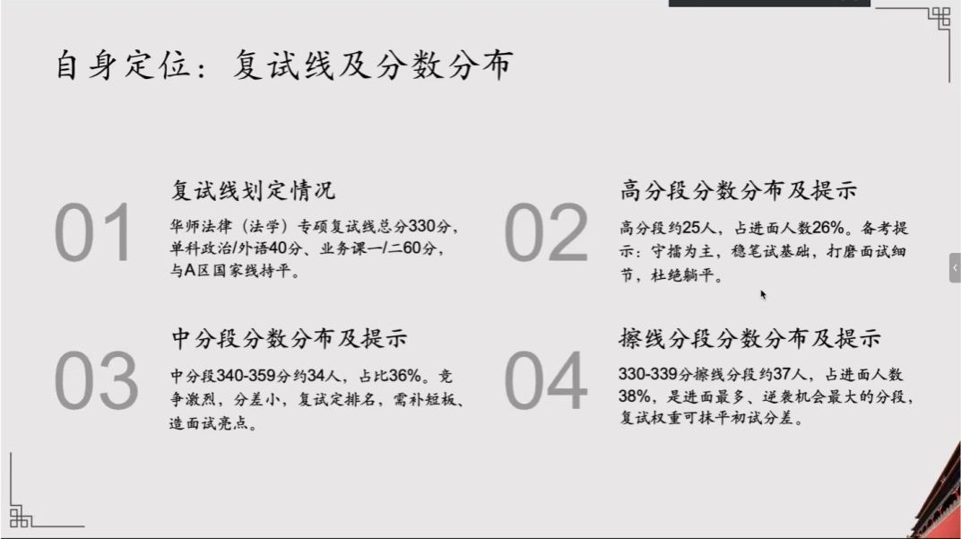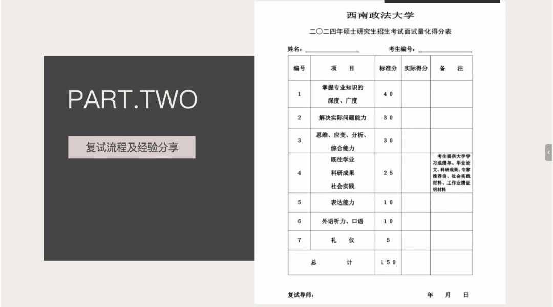 西南政法大学的招嘉玟则详细介绍了复试个人简历的材料筹备方法,还建议复试考生提前登录目标院校官网,查阅复试考核量化表等相关内容。谈及复试笔试的“提分技巧”,她特别强调案例分析的逻辑性,还分享了自己考前整理积累的热点案例库。