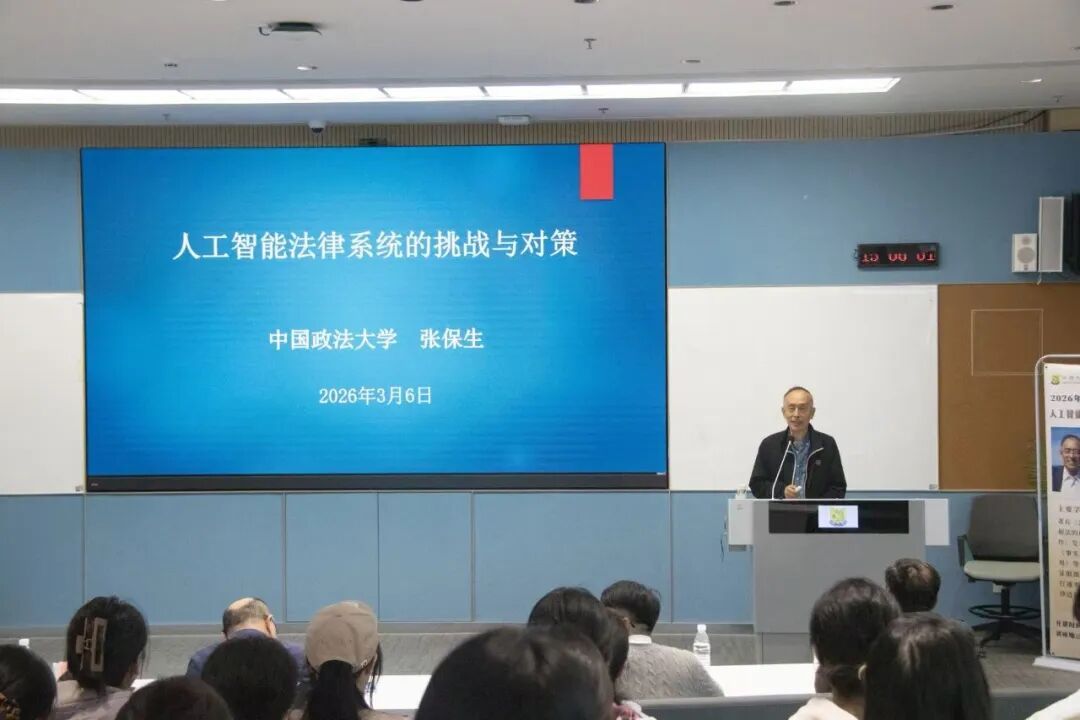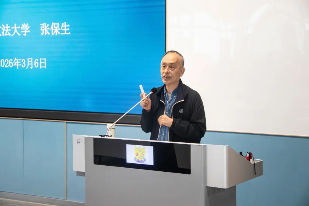 3月6日下午,法学院与格致书院联合举办2026年“崇法景行 至公守正”法律文化节开幕式暨法律专题讲座。开幕式特邀中国政法大学原副校长张保生教授,就“人工智能法律系统的挑战与对策”这一主题开展专题讲座。法学院院长邓剑光教授、党委副书记张丽婷、法律系主任张扩振副教授、李守良教授,以及160余名同学参与了此次活动。活动由邓剑光院长主持。