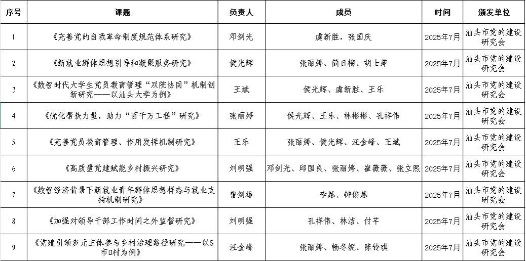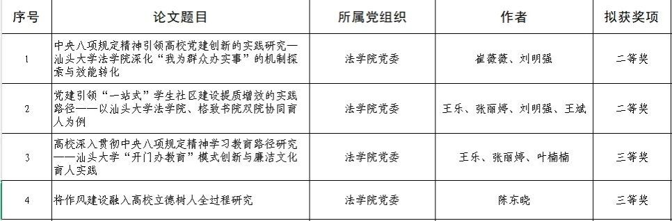 汕头市委教育工委通报2025年全市教育系统党建工作优秀成果,我院报送的《党建领航融合赋能:双院协同视域下高校高质量发展的路径探索——以汕头大学法学院、格致书院为例》(作者王乐等)获“党建好案例”;《党建引领青春路 育人共赴新征程》(法律本科生党支部副书记王乐)获“书记好党课”。