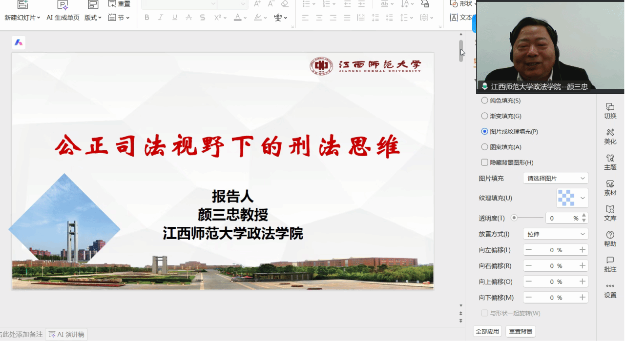 11月28日晚,由法学院举办的“公正司法视野下的刑法思维”专题讲座在线上成功举行。本次讲座特邀江西师范大学政法学院学术委员会主任、全国明德教师奖获得者、资深刑法学者颜三忠教授担任主讲,为法学院师生带来一场兼具理论深度与实践指导意义的学术盛宴。讲座由法律系张丽琴教授主持。